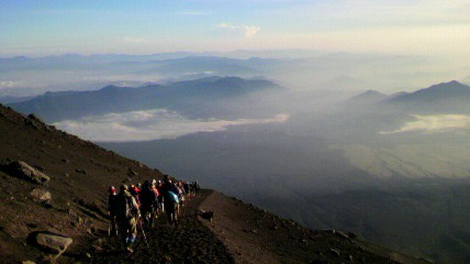 私が2010年8月末に初めて富士山をグループで登山した時の写真が以下の3枚です。確か、8合目 (高さ3300m)付近のコテージに泊まり、早朝4時前から山頂を目指してグループで登り始め、山頂から見た日の出の美しさ、荘厳さ、神秘性は今も目に焼き付いています。是非、あなたも経験してください。ただし、登山前から十分な準備運動(特に脚力の強化)をしておいて下さい。途中で歩けなくなることがあります。